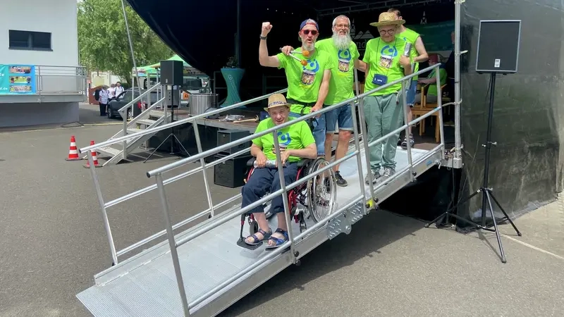 Mit Hilfe einer speziellen Rampe wird die mobile Veranstaltungsbühne der Stadt St. Wendel auch für Besucher*innen und Akteur*innen mit Rollstuhl oder mit einer Gehbehinderung zugänglich.