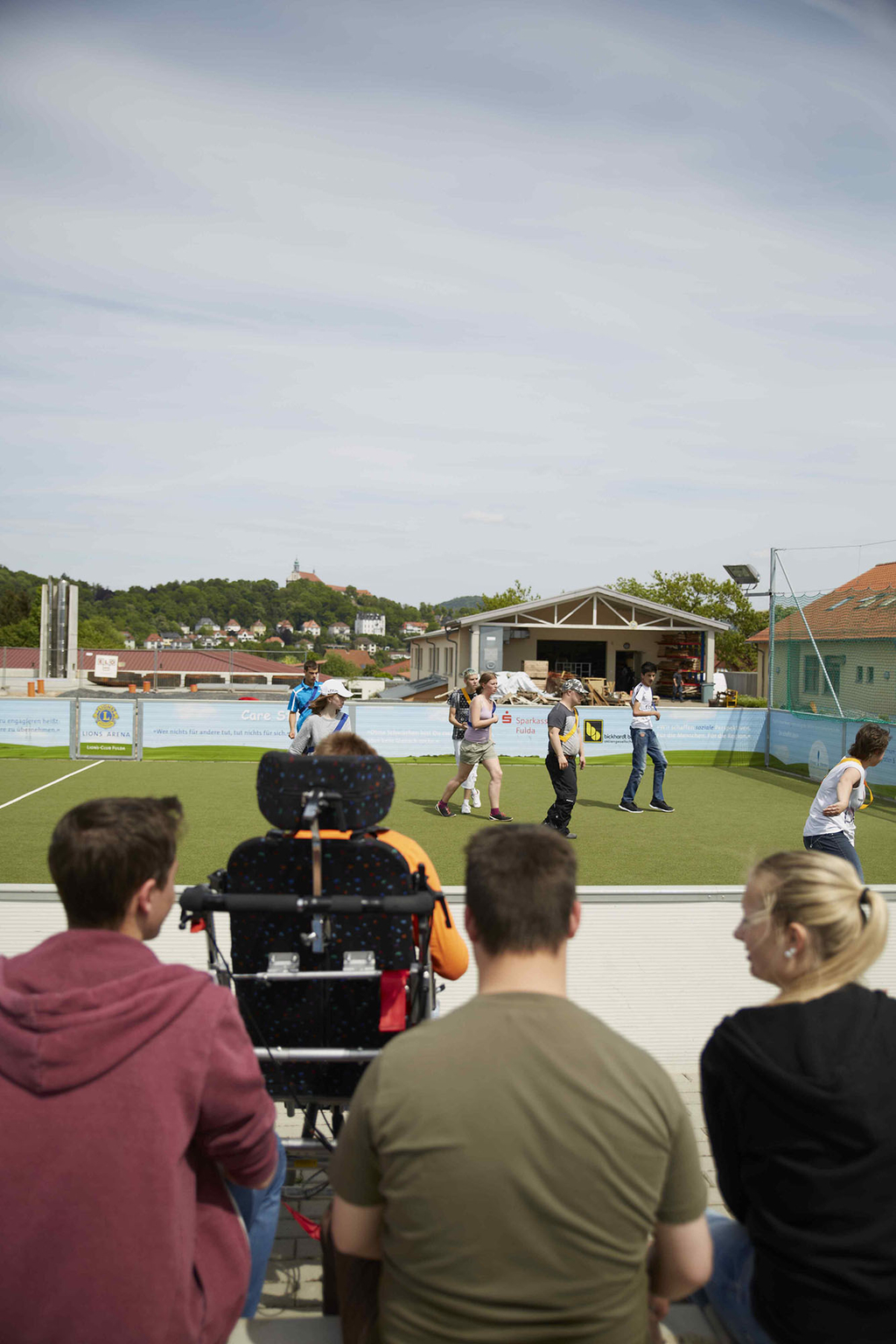 Auf dem „Soccerfeld“ in Fulda kann man nicht nur Fußball spielen. Auch Basketball-, Volleyball- und Handballbegeisterte mit und ohne Behinderung kommen auf dem Sportplatz des Antoniusheims auf ihre Kosten. Der Grundgedanke: Eine offene, inklusive Sportstätte anzubieten, die Menschen mit und ohne Behinderung zu jeder Jahreszeit miteinander in Kontakt bringen kann.