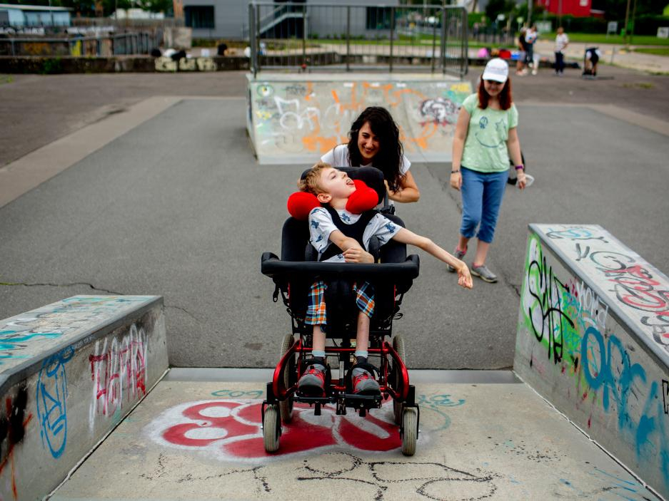 Junge Rollifahrer*innen sind beim neuen Angebot des Vereins SEHstern ebenso willkommen wie Kinder und Jugendliche mit anderen körperlichen oder kognitiven Behinderungen. Gemeinsam mit Gleichaltrigen ohne Behinderung geht es in die Skateparks der Umgebung, um Kurven zu fahren und Sprünge zu üben.
