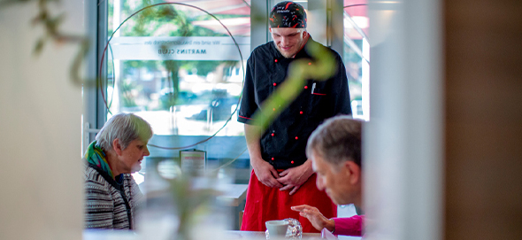 Ob in der Küche oder im Gastraum: Rund die Hälfte aller Mitarbeiter im Rotheo haben eine Schwerbehinderung – und einen festen Job auf dem ersten Arbeitsmarkt. So servieren sie ihren Gästen nicht nur leckere Speisen, sondern zeigen auch täglich, wie selbstverständlich das Miteinander von Menschen mit und ohne Behinderung in der Arbeitswelt gelingen kann. Mit dem Bistro möchte der Martinsclub in Bremen aber noch mehr erreichen: Mit seinen hellen, einladenden Räumen ist das Rotheo auch ein Treffpunkt für alle Bewohner des Stadtteils Kattenturm. Die Anwohner wurden befragt, welche Angebote sie sich im Bistro wünschen – und diese werden nun auch selbstverständlich berücksichtigt. Der Gastraum ist barrierefrei gestaltet, so dass alle Gäste das Bistro nutzen können – als Nachbarschaftstreff und natürlich auch, um lecker essen zu gehen.