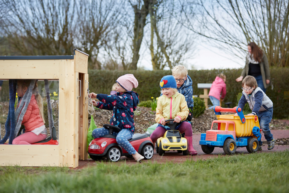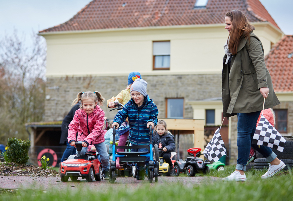 Auf der „Bobby Bahn“ in Detmold ist immer was los. Ob mit Rollstuhl, Rollator, Spezial-Fahrrad oder mit dem Bobbycar: Die Kinder der inklusiven Kita Vahlhausen in Detmold lieben den großen Parcours und befahren ihn mit allem, was Räder hat. Gleichzeitig lernen Kinder mit und ohne Behinderung hier, spielerisch miteinander umzugehen und aufeinander zu achten.