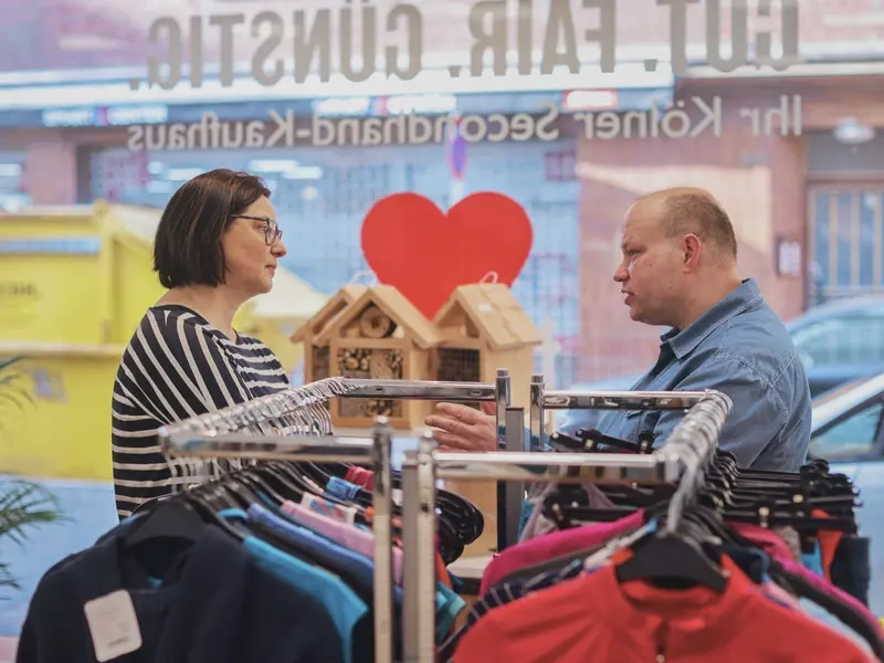 Eine schicke Damenbluse, ein gutes Buch für den Urlaub oder ein Wasserkocher für die Küche: Im Kölner fairstore gibt es jede Menge Schnäppchen. Vom Verkauf der gespendeten Gebrauchtwaren profitieren nicht nur Menschen mit wenig Geld, sondern auch die Umwelt.