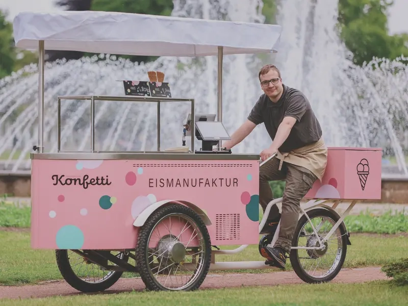 Im Café „Konfetti“ im egapark Erfurt gibt es alles, was das Herz von Eis-Liebhaber*innen höherschlagen lässt: Viele handgemachte Eissorten, leckere Toppings, Waffeln und Gebäck stehen zur Auswahl. Beim Inklusionsunternehmen der Lebenshilfe arbeiten Menschen mit und ohne Behinderung in festen, sozialversicherungspflichtigen Jobs zusammen. Nicht nur im Café, auch an verschiedenen Stellen im Park und im Stadtgebiet verkauft das inklusive Team mit einem neuen Eis-Mobil seine Waren.