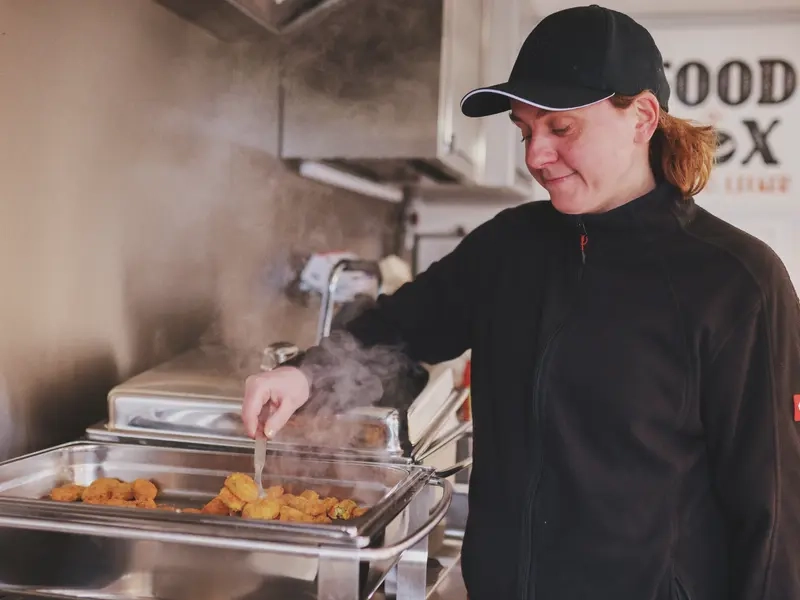 Die Mitarbeiter*innen mit und ohne Behinderung haben am Konzept der Food Box mitgearbeitet und viele gute Ideen eingebracht. Es wurde zum Beispiel eine niedrige Speisenausgabe eingebaut, um barrierefreien Zugang für Rollstuhlfahrer*innen, kleinwüchsige Menschen und Kinder zu schaffen. Die digitale Kasse an Bord kann zudem auch von Menschen bedient werden, die nicht gut lesen oder rechnen können. So finden alle Mitarbeiter*innen optimale Bedingungen für die Arbeit im inklusiven Team.