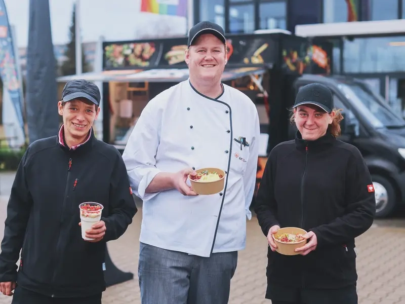 Das Inklusionsunternehmen MDS aus Münster bietet Menschen mit und ohne Behinderung seit 2001 feste Arbeitsplätze in den Bereichen Catering, Kantinen und Gastronomie an. Seit kurzem ist das Team auch mobil unterwegs: Die Food Box, ein kastenförmig umgebauter Mercedes Sprinter, bringt Speisen und Getränke zu Firmen, die für Mitarbeiter*innen oder Veranstaltungen Catering im Außenbereich anbieten möchten. Auch Privatkundschaft versorgt sich an der Food Box mit leckerem Essen.