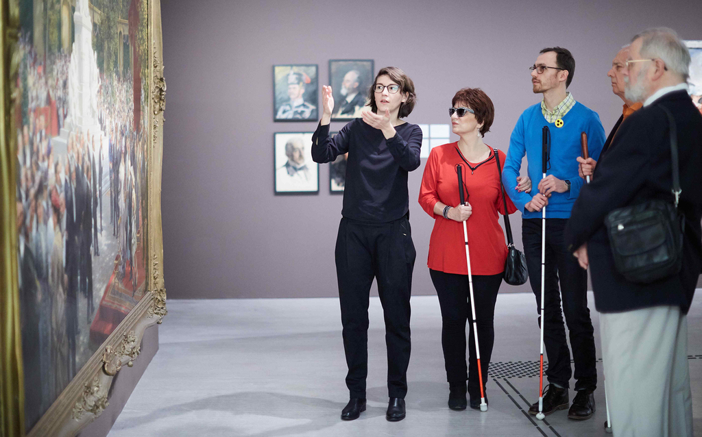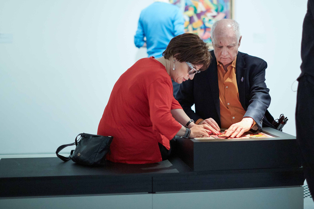 Wie muss ein Kunstwerk beschaffen sein, damit es blinde Besucher erleben können? Wie finden Besucher mit Sehbehinderungen eigenständig ihren Weg durch ein Museum? Und wie können sich blinde, sehbehinderte und sehende Besucher über die Kunst vor Ort am besten informieren? Diesen und anderen Fragen hat sich die Berlinische Galerie gemeinsam mit dem Deutschen Blinden- und Sehbehindertenverband e.V. gestellt. In einem zweijährigen Projekt wurde die aktuelle Sammlungspräsentation „Kunst in Berlin 1880–1980“ für blinde und sehbehinderte Menschen barrierefrei umgestaltet.Um Besuchern mit unterschiedlichen Sehbehinderungen die Sammlung eigenständig zugänglich zu machen, wurde im Herbst 2017 ein 300 Meter langes, taktiles Bodenleitsystem verlegt, eine Museumsapp mit 17 Hörstationen programmiert, Tastmodelle realisiert sowie Tastführungen zu berühmten Werken der Sammlung der Berlinischen Galerie ins Vermittlungsangebot aufgenommen. Die sieben Tastmodelle, die in den Sitzbänken vor den Originalen eingelassen sind, bieten einen sehr direkten Zugang zu den Bildern: „Ein Tastbild spricht zu mir wie das Gemälde zu einem Sehenden", sagt Reiner Delgado vom Deutschen Blinden- und Sehbehindertenverband, der das mehrjährige Projekt mitentwickelt hat. Damit wurde erreicht, dass Kunst mit allen Sinnen erfahrbar wird.