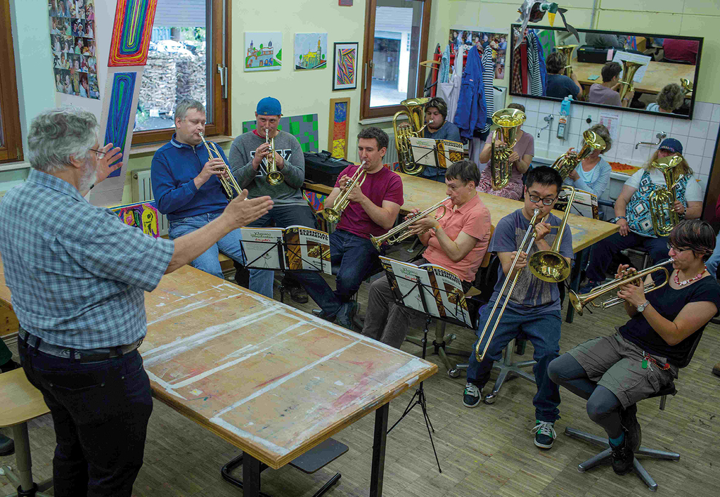 Ob Tuba, Posaune oder Horn: Die Mitglieder der „Brass Band Rosenharz“ lieben ihre Blechblasinstrumente. Der Wunsch, in einem Orchester mitzuspielen und das Publikum zu begeistern, treibt sie an. Seit einem Jahr nehmen die angehenden Musiker mit und ohne Behinderung aus der Werkstatt in Rosenharz nun Unterricht an der Musikschule Ravensburg. Für ihren Musiklehrer Horst Guist gilt kein „Ich kann das nicht.“ Mit Geduld, dem Gespür für die Töne und die Instrumente und viel Spaß am gemeinsamen Musizieren tasten sich alle an den ersten großen Auftritt heran. Der erste Meilenstein – eine große Orchesterprobe – ist schon geschafft. Nun steht weiteren Auftritten in nächster Zeit nichts mehr im Wege.
