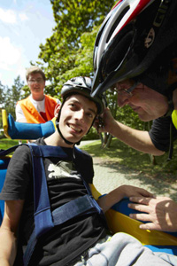 Hier dreht sich alles ums Rad: Wenn sich die 30 Projektteilnehmer vom „Inklusiven Radlabor“ einmal wöchentlich zusammenfinden wird nicht nur repariert, geölt, getüftelt, gepumpt oder geschraubt. Dann wird auch trainiert. Werden im Fuhrpark oder auf dem selbstgebauten Radparcours eigene Geschicklichkeitsspiele ausprobiert und das erlernte Wissen über Sicherheit im Straßenverkehr direkt an die Neuen im Projekt weitergegeben. Manchmal legen die Jungs aber auch einen Gang zu. Dann drehen sie mit der Action-Cam rasante Videos auf ihren Tandems und sogenannten „Rollfiets“ – das sind Rollstuhlfahrräder – oder fahren nach Zeit.