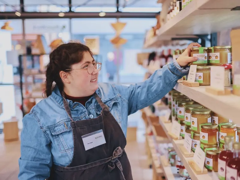 Der Mainwerk Marktstand ist ein kleines, aber feines Ladenlokal im Herzen von Würzburg. Hier verkaufen Menschen mit und ohne Behinderung hochwertige Lebensmittel und schöne Dinge zum Verschenken oder Behalten.
