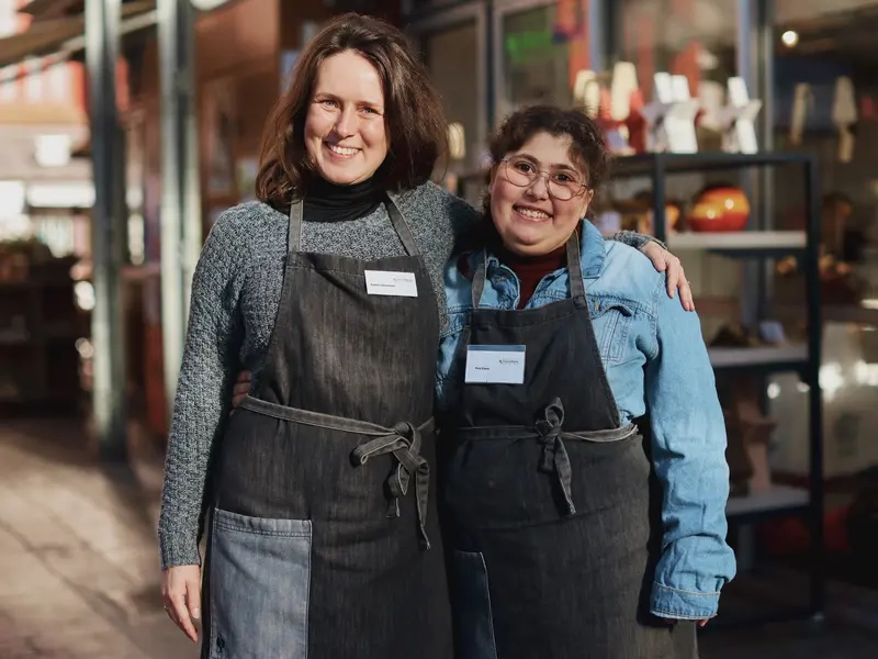 Der neue Laden unter dem Glasdach des Marktes in Würzburg kommt bei den Kund*innen gut an, die sowohl die schönen Produkte als auch die freundliche Beratung des inklusiven Teams zu schätzen wissen.