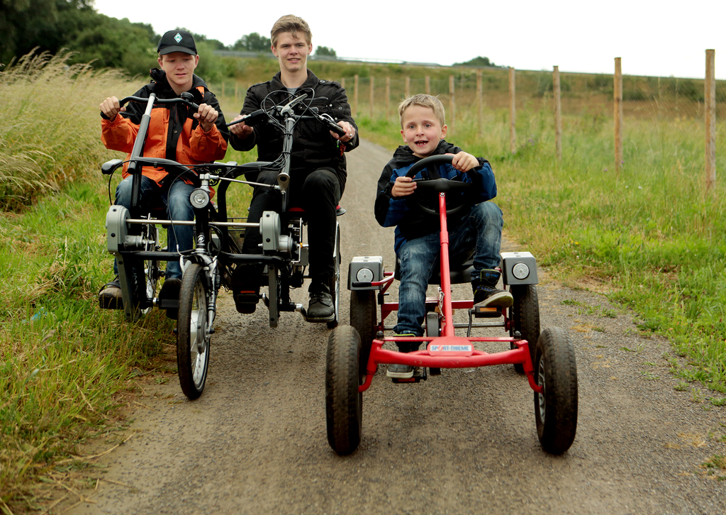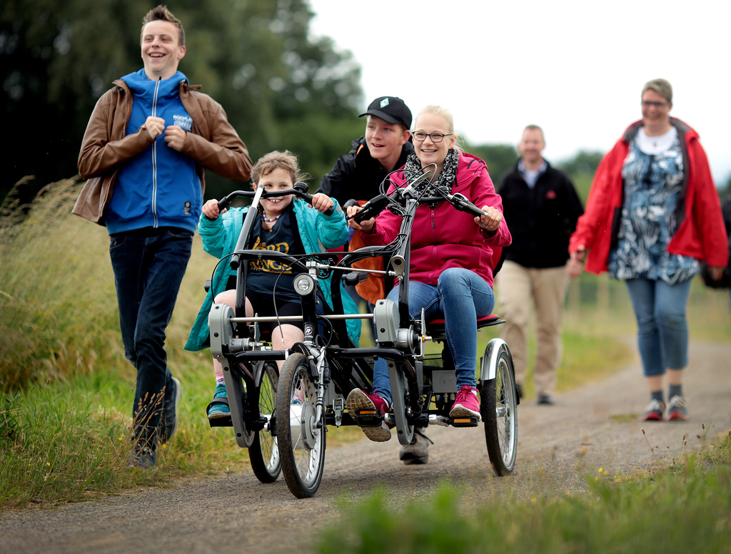 Mit einem Tandem der etwas anderen Art erkunden Kinder und Jugendliche mit und ohne Behinderung den Kreis Borken. Mit dem „Rollfiets“ des DRK, auf dem ein Fahrer mit Gehbehinderung und einer ohne Behinderung zusammen fahren können, kommt die Inklusion im Münsterland ins Rollen.