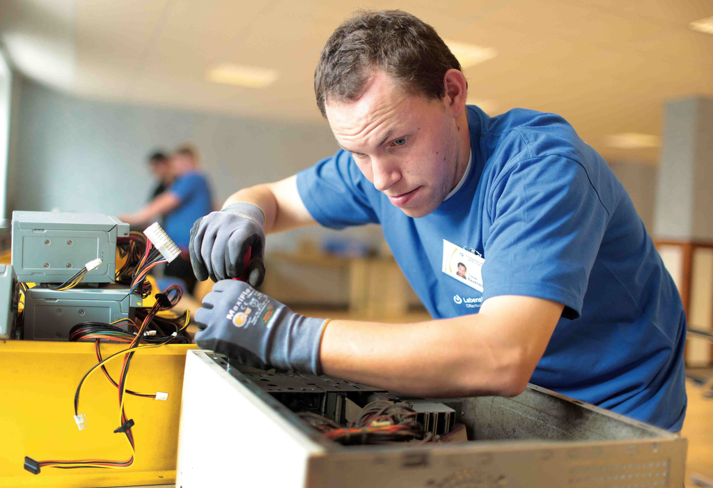 „Arbeit für alle“ - mit diesem Motto bringt die iD integrierte Dienste gGmbH seit drei Jahren vor allem Jugendliche mit Behinderung in feste Beschäftigungsverhältnisse. Acht Menschen, davon vier mit Behinderung, beschäftigt das Offenburger Integrationsunternehmen zurzeit. Von der Reparatur und umweltgerechten Entsorgung von Computern bis zum Digitalisieren, Archivieren oder Löschen von Daten erledigen die Angestellten einfache Arbeiten im IT-Bereich. Diese sind ihren persönlichen Fähigkeiten individuell angepasst. Um später nach bestem Können gleichberechtigt im Unternehmen mitzuarbeiten, durchlaufen die 18- bis 25-Jährigen zunächst in einem barrierefreien und geschützten Umfeld eine rund zweijährige Ausbildung. Unterstützt von Jobcoaches lernen die Azubis hier den Arbeitsalltag in all seinen Facetten kennen. Mit seinen Aktivitäten möchte das Unternehmen auch andere Arbeitgeber und Ausbilder vor Ort für die Zusammenarbeit mit Menschen mit Behinderung begeistern.