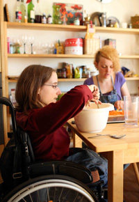 Putzen, Spülen, selbst einkaufen oder einfach mal zusammen um die Häuser ziehen. Diese Dinge waren für Josefine Zaltenbach früher nicht selbstverständlich – zumindest nicht in den eigenen vier Wänden. Heute lebt die 24jährige Rollstuhlfahrerin gemeinsam mit zwei Mitbewohnern ohne Behinderung in einer inklusiven und barrierefreien Wohngemeinschaft im Freiburger Rieselfeld. Für die junge Wahl-Freiburgerin bedeutet diese Art des Zusammenlebens vor allem, dass sie ihren Alltag völlig selbstbestimmt gestalten und nach ihren Vorstellungen am Leben mitten in der Gemeinde teilnehmen kann. „Ich kann in die Stadt, wann ich will, bin viel selbständiger geworden und habe mittlerweile kochen gelernt.“ Auf sich allein gestellt ist sie bei ihren Aktivitäten aber keineswegs: ihre Mitbewohner sind nicht nur Zimmergenossen und gute Freunde, sondern auch ihre Assistenten – das gehört mit zum Konzept dieser WG-Konstellation. Der Umfang der Unterstützung im Alltag wird zwischen den Wohnungsbewohnern und der Lebenshilfe Freiburg abgestimmt.