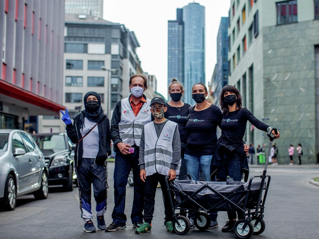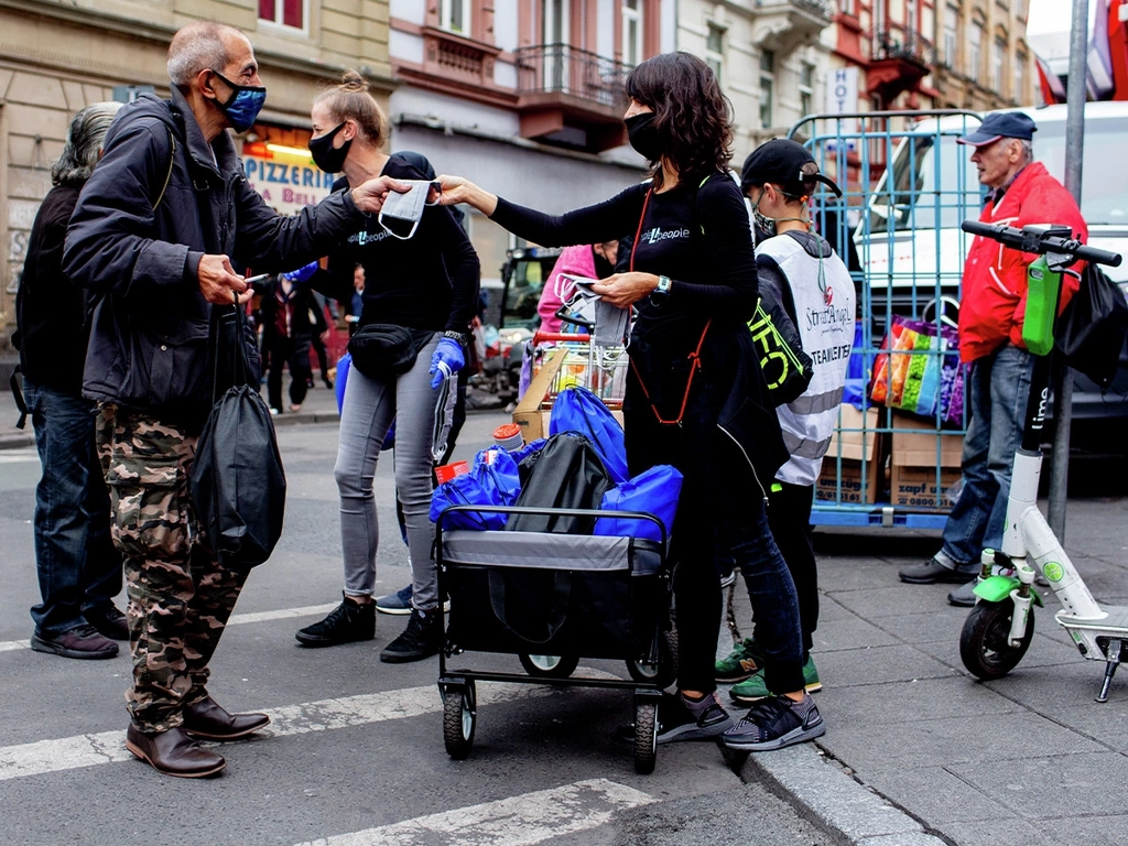 Lebensmittel, Hygieneartikel, Schlafsäcke und Isomatten: Vielen obdachlosen Menschen fehlen diese überlebenswichtigen Dinge zurzeit. Der Verein people4people sammelt daher Spenden von Unternehmen und Privatpersonen im Raum Frankfurt. Ehrenamtliche Helfer*innen verpacken die Spenden in „Carepacks“ und verteilen diese in der Frankfurter Innenstadt und auch am Bahnhof. Mitglieder der „StreetAngel“ unterstützen die Aktion, denn der Verein kennt die Szene und engagiert sich schon lange für wohnungslose Menschen. Bei den Betroffenen selbst kommt die Hilfe gut an. Sie freuen sich nicht nur über die Spenden, sondern auch über ein offenes Ohr der Ehrenamtlichen. Außerdem begrüßen sie es, dass auch Masken verteilt werden. Denn der fehlende Anschluss ans gesellschaftliche Leben wird ohne Maske zurzeit noch einmal deutlicher spürbarer für sie.