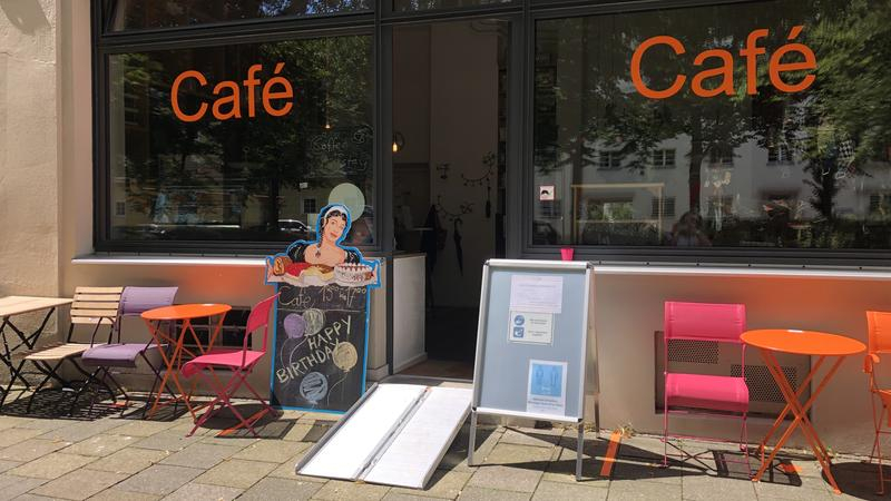 Eine mobile Rampe sorgt dafür, dass auch Menschen mit Rollator, Rollstuhl oder Kinderwagen das Café ohne fremde Hilfe besuchen können.