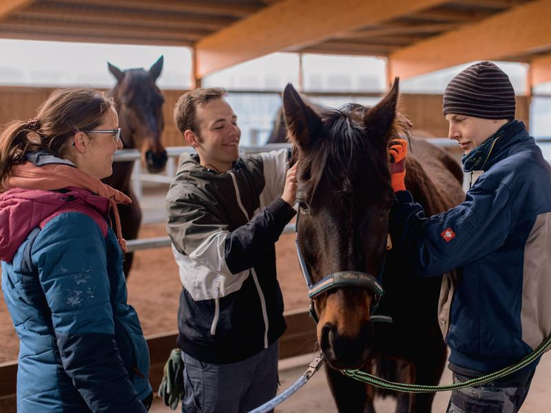 Die Mitarbeiter*innen mit und ohne Behinderung sorgen dafür, dass im Alltag alles reibungslos läuft. In der Verwaltung und vor allem auch im Stallteam haben Menschen mit Behinderung hier feste, sozialversicherungspflichte Arbeitsplatze gefunden. Die liebevolle Versorgung der Pferde und das Sauberhalten von Ställen und Außenanlagen gehört zu ihren Aufgaben. Je nach Vorlieben, Stärken und Fähigkeiten werden die drei behinderten Mitarbeiter des Stallteams dort eingesetzt, wo es am besten für sie passt. Alle fühlen sich so im inklusiven Team gut aufgehoben und haben die Chance, neue Dinge zu lernen und sich beruflich weiterzuentwickeln.