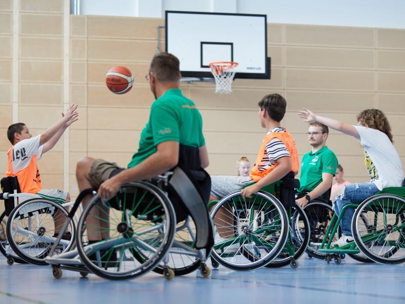 Eine coole und rasante Sportart kennenlernen und gleichzeitig Berührungsängste abbauen: Darum geht es beim Projekt „We will roll you“ im Raum München. Erfahrene Sportler*innen und Trainer*innen zeigen den Kindern, wie sie mit schnellen Sportrollstühlen umgehen können. Die Schulkinder lernen, wie man im Sitzen Körbe wirft und dabei ganz selbstverständlich miteinander umgeht.