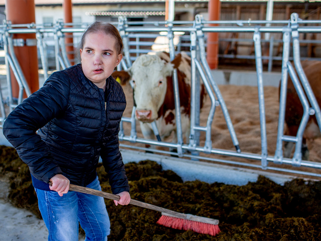 Auf dem „Chiemgauer Schulbauernhof“ gibt es viele verschiedene Arbeitsbereiche. Die Mitarbeiter*innen sind zum Beispiel im Bereich Teamassistenz tätig oder unterstützen die Bewirtschaftung des Landschulheims. Auch bei landwirtschaftlichen Arbeiten und Aufgaben im Bereich Umweltbildung packen sie mit an. Von den neun festen Mitarbeiter*innen des „Chiemgauer Schulbauernhofs“ leben vier mit einer Behinderung. Da das Schullandheim wegen des Beherbergungsverbots seit vielen Monate geschlossen bleiben muss, stellt die Corona-Pandemie das gemeinnützige Unternehmen vor große wirtschaftliche Herausforderungen. Mit den Geldern aus der Corona-Soforthilfe der Aktion Mensch sanierte und verkleinerte der Hof die Gästezimmer nach einem eigens entwickelten Hygieneschutzkonzept. Künftig schlafen weniger Gäste gemeinsam in einem Zimmer. Außerdem baute das Team den Bereich Direktvermarktung von Biofleisch in der Region aus. Die Mitarbeiter*innen nutzen die Zeit ohne Gäste und Schulklassen zudem für interne Fortbildungen im Bereich der Digitalisierung.