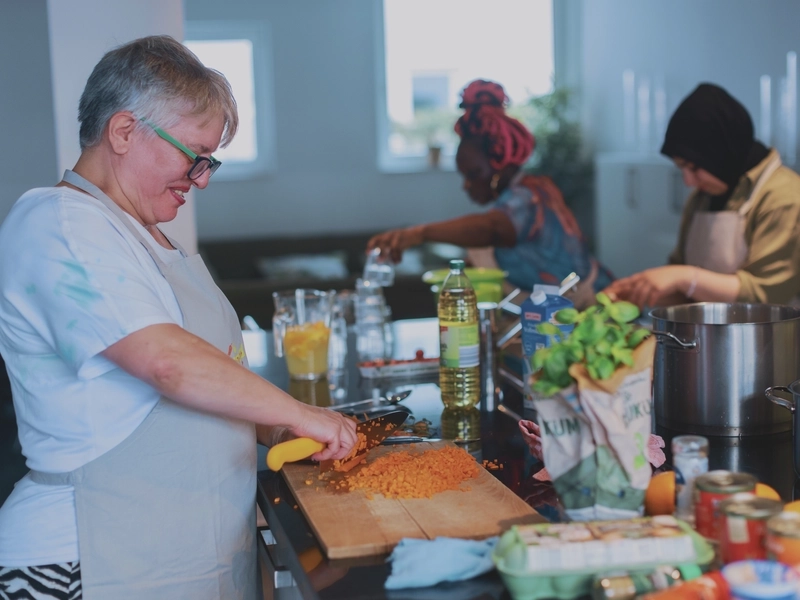 Junge Erwachsene mit und ohne Behinderung sowie Flucht- und Migrationsgeschichte lassen es sich bei diesem Projekt zusammen schmecken. Durch das gemeinsame Kochen und Essen erfahren sie Wertschätzung und stärken sich gegenseitig.