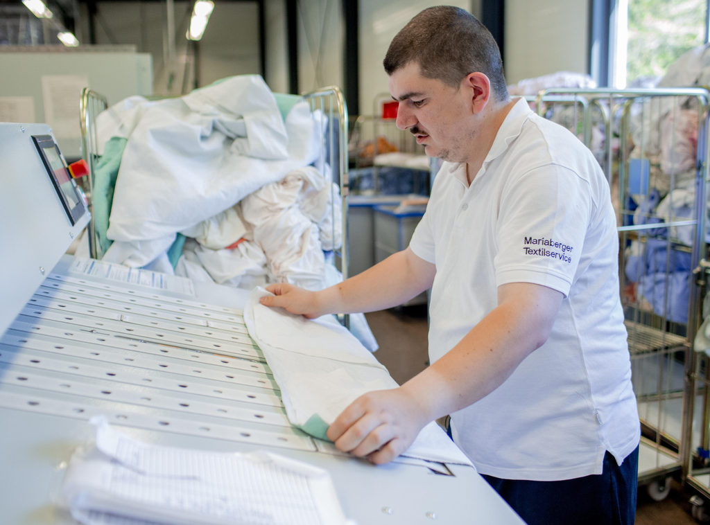 Waschen, trocknen, falten: In der Mariaberger Textilservice gGmbH in Gammertingen dreht sich alles um saubere Wäsche. Mitarbeiter*innen mit und ohne Behinderung sorgen dafür, dass die Textilien ihrer Kunden im Landkreis Sigmaringen professionell gereinigt werden.