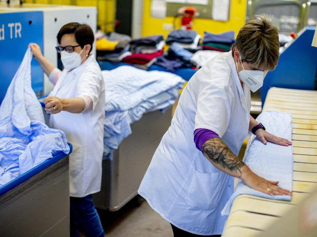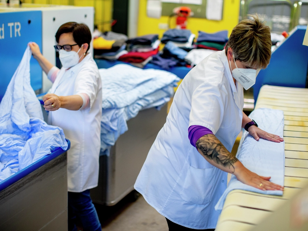 Zu den Kunden der Mariaberger Textilservice gGmbH zählen neben Wohngruppen und Einrichtungen des diakonischen Trägers Mariaberg auch regionale Gastronomie- und Hotellerie-Betriebe. Bedingt durch die Corona-Pandemie gingen Aufträge aus diesen Bereichen zeitweise stark zurück oder brachen ganz ein. Das gemeinnützige Unternehmen setzte Maßnahmen zum Schutz der Mitarbeiter*innen um und überbrückte die Zeit mit Kurzarbeit und durch den Abbau von Urlaubstagen und Überstunden.