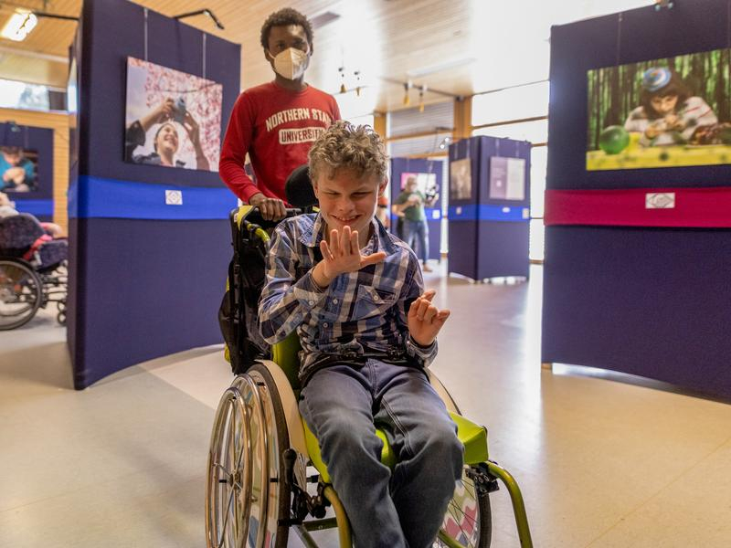 Florenell ist einer von vielen Kindern, Jugendlichen und jungen Erwachsenen mit unterschiedlichen (Seh-)Behinderungen, die im Sonderpädagogischen Bildungs- und Beratungszentrum (SBBZ) in Baindt leben. Zwölf der Bewohner*innen können Besucher*innen der Ausstellung „Mit anderen Augen sehen“ näher kennenlernen. Die Kinder und Jugendlichen hatten sich für das Projekt zuvor an ihren Lieblingsplätzen fotografieren lassen. Zunächst hören sich die Besucher*innen mit geschlossenen Augen eine Audio-Beschreibung eines Fotos an. Dann erleben sie eine Simulation davon, wie die sehbehinderten Kinder und Jugendlichen selbst das Bild sehen würden. Zum Schluss betrachten die Besucher*innen das Original-Porträt und erfahren mehr über die jeweilige Sehbehinderung der Abgebildeten.