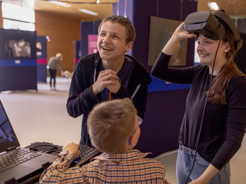 In der Ausstellung kommt auch Virtuelle Realität (VR) zum Einsatz: Die Nutzer*innen erleben mit einer VR-Brille Alltagssituation wie einen Einkauf, ein Essen mit Freund*innen oder eine Szene im Straßenverkehr. Mit Filter-Funktionen wird dann gezeigt, wie diese Szenen mit einem stark eingeschränkten Gesichtsfeld wahrgenommen werden.