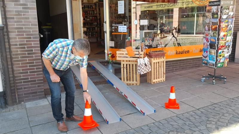 Durch die Anschaffung einer mobilen Rampe können nun auch Besucher*innen, die einen Rollstuhl nutzen, einen Kinderwagen schieben oder mit Rollator unterwegs sind, problemlos und ohne fremde Hilfe im Weltladen einkaufen.