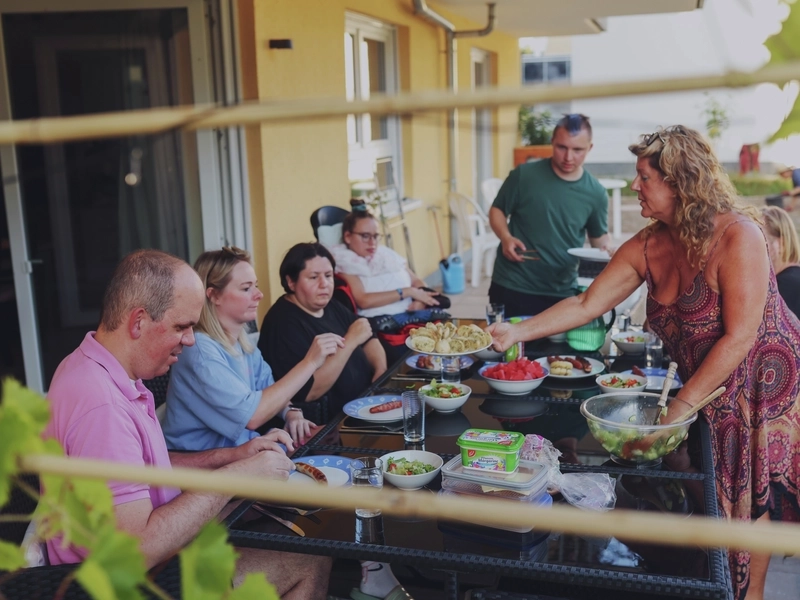 Schon vor dem Einzug ins neue Zuhause hatten interessierte Menschen mit Behinderung die WG mit geplant. Im barrierefreien Neubau richtete sich dann jeder und jede das eigene Zimmer selbst ein. Im Rahmen dieses Projekts wurde die Einrichtung der Gemeinschaftsräume gefördert, also der Wohn- und Essbereich, der Hauswirtschaftsraum, die Küche, der Flur und die Bäder. So steht einem geselligen WG-Leben nichts mehr im Weg
