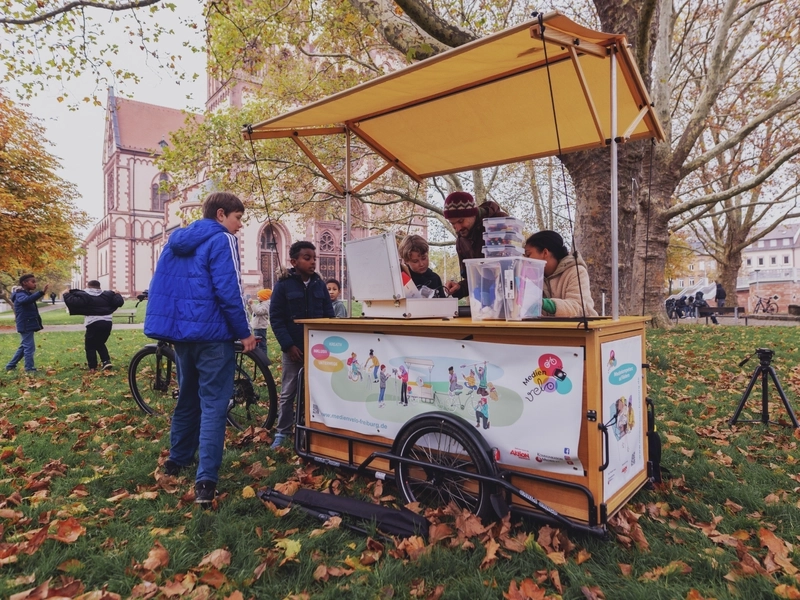 Das Medienvelo steht regelmäßig auf dem Stühlinger Kirchplatz in Freiburg und kommt bei Festen, Events und Märkten zum Einsatz. Mit seinen Mitmachaktionen, bei denen alle einfach spontan mitmachen können, möchte das Team alle Kinder und Jugendlichen erreichen. Die jungen Teilnehmenden kommen auf kreative, spielerische Weise mit neuen Medien in Kontakt und werden in ihrer Medienkompetenz gestärkt.